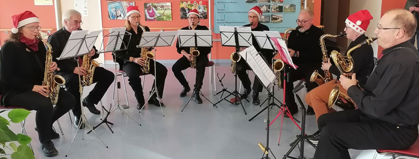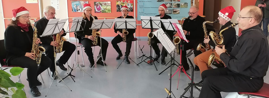 Als kleines Dankeschön dafür, dass beim Doppelkonzert mit dem Landespolizeiorchester Baden-Württemberg im Oktober Räumlichkeiten für ein gemeinsames Essen zur Verfügung gestellt wurden, hat das Saxophon-Register der Stadtmusik Lörrach den Bewohnerinnen und Bewohnern des Pflegeheims Margaretenheim eine besondere Freude bereitet. Am Samstag vor dem dritten Advent sorgten die Musikerinnen und Musiker rund eine Stunde lang für eine stimmungsvolle musikalische Darbietung. Auf dem Programm standen vor allem bekannte Weihnachtslieder, bei denen die Heimbewohner sowie deren Angehörige herzlich zum Mitsingen eingeladen waren. Für alle Beteiligten war es ein gelungener musikalischer Beitrag zur Adventszeit